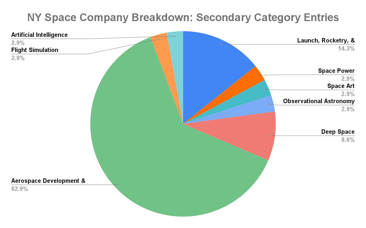 Secondary Categories - Secondary sub-sectors still tracked and studied, but for various reasons are not major targets for growth in the New York space ecosystem. These are still active areas of investment in New York! However they are often either low-growth fields more generally or there are other external factors at play such as limitations in talent or resources. Below is a chart and then itemized list of the Secondary Categories Empire Space has identified.